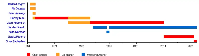 - Lloyd Robertson (1976–2011, co-anchor from 1976 to 1984, chief anchor from 1984 onward)