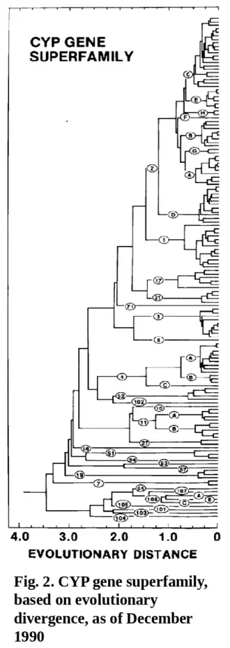- ^ a b Nebert, DW; Nelson, DR; Coon, MJ; Estabrook, RW; Feyereisen, R; Fujii-Kuriyama, Y; Gonzalez, FJ; Guengerich, FP; Gunsalus, IC; Johnson, EF (January 1991). "The P450 superfamily: update on new sequences, gene mapping, and recommended nomenclature". DNA and Cell Biology. 10 (1): 1–14. doi:10.1089/dna.1991.10.1. PMID 1991046.