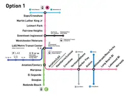 The debate over service patterns proved somewhat contentious, as the final pattern must balance the needs of riders, operational needs, and the political constituencies of Metro's board members.[27] In 2018, with the line then scheduled to open within the year, the Metro Board of Directors overrode a recommendation by operations staff that would've had a single line operating between Expo/Crenshaw and Norwalk station. Passengers from the Redondo Beach area would have been served by a shuttle to the LAX area, where they would need to transfer to another train to continue east or north. Instead, board members approved a one-year pilot of a configuration that would combine an Expo-to-Norwalk line with another line that would connect Redondo Beach with Willowbrook/Rosa Parks station, allowing transfers to the A and J Lines.[28][29] The approved plan would incur higher operating expenses, but board members argued it would retain better transfer opportunities for South Bay residents.[30]