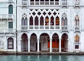 The facade is divided into three distinct stories: a lower loggia (covered corridor), a middle balcony, and an upper balcony.[4] Other nearby buildings in this style are Palazzo Barbaro and the Palazzo Giustinian. This linear style favoured by the Venetian architects was not superseded by Venetian Renaissance architecture until the end of the 15th century, or later.