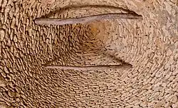 Entrances look downhill and extend all the way up to the roof eaves. Their uprights are made of dressed stones alternating as headers and stretchers.[7] They are capped by outer and inner wooden lintels, right under the eaves. They are fitted with a wooden door.