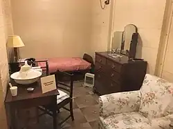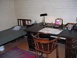 Churchill's office-bedroom, open from 27 July 1940,[24] included BBC broadcasting equipment; Churchill made four wartime broadcasts from the Cabinet War Rooms, the first being on 11 September 1940.[25] Although the office room was also fitted out as a bedroom, Churchill rarely slept underground,[26] preferring to sleep at 10 Downing Street or the No.10 Annexe, a flat in the New Public Offices directly above the Cabinet War Rooms.[27] His daughter Mary Soames often slept in the bedroom allocated to Mrs Churchill.[28]