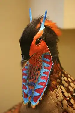 Cabot's tragopan (Tragopan caboti) is a pheasant found in south-east China. The common and scientific names of this large bird both commemorate the ornithologist Samuel Cabot III.[3] Other common names include the Chinese tragopan and the yellow-bellied tragopan. The population is divided into two subspecies, of which the dominant subspecies is found in the provinces of Fujian, Jiangxi, Zhejiang, and Guangdong, and T. c. guangxiensis is confined to northeastern Guangxi and southern Hunan. The IUCN has assessed it as being a "vulnerable species".
