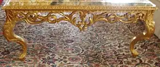 According to Bird, "nothing symbolises 18th century furniture more than the cabriole leg."[2] The cabriole design is often associated with bun or the "ball and claw" foot design. In England, this design was characteristic of Queen Anne and Chippendale furniture.[3] In France, the cabriole leg is associated with the Louis XV period of furniture design.[4] The cabriole design appeared for the first time in the United States in the 18th century.[5] The basis of its original concept was emulated upon legs of certain four-footed mammals, especially ungulates. The etymology of this term specifically derives from the French word cabrioler, meaning to leap like a goat.[6]