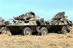 Relatively large-gunned variants of the V-100 began appearing in 1964, when Cadillac Gage marketed the Commando against the Alvis Saladin and Panhard AML-90 for a Royal Saudi Army requirement specifying a wheeled armoured vehicle equipped with a large semi-automatic cannon.[16] A number of V-150s were later successfully tested and offered with a Mecar low-pressure 90 mm smoothbore gun. With the new turret and gun, the V-150 was manned by a crew of three, although it retained enough space for eight additional passengers if no additional shell racks were added.