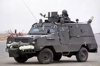 The Cadillac Gage Ranger, known popularly and in United States military service as the Cadillac Gage Peacekeeper or Cadillac Gage Peacekeeper I, is a four-wheeled armored personnel carrier marketed as an internal security vehicle, produced by Cadillac Gage (now Textron Marine & Land Systems). Built on a Dodge truck chassis, production began in 1979 to produce an armored vehicle for the United States Air Force (USAF) Security Forces, its largest customer, though Luxembourg and Indonesia also reportedly used Rangers as well. The Ranger also saw considerable service with law enforcement as a SWAT vehicle.