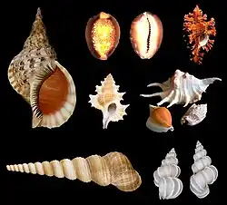 Caenogastropoda contains many families of shelled marine molluscs – including the periwinkles, cowries, wentletraps, moon snails, murexes, cone snails and turrids – and constitutes about 60% of all living gastropods.[4]