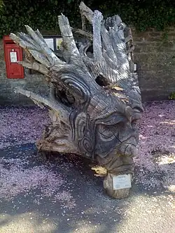 Caerleon also has associations with later Arthurian literature as the birthplace of the writer Arthur Machen who often used it as a location in his work. Alfred Tennyson lodged at The Hanbury Arms while he wrote his Morte d'Arthur (later incorporated into his Idylls of the King).[34] Today Caerleon has a modern statue of a knight, "The Hanbury Knight", in reflecting stainless steel by Belgian sculptor Thierry Lauwers.[35] In Michael Morpurgo's novel Arthur, High King of Britain, Caerleon is the castle where Arthur unknowingly commits incest with his half-sister Morgaine, resulting in the conception of his son Mordred who will later bring about his downfall. Mary Stewart's account of the Arthurian legends also mentions Caerleon as a place where Arthur held court. In that telling, the incest took place at Luguvalium.[36]