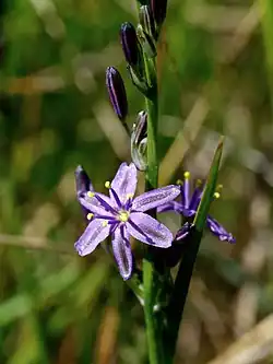 Caesia calliantha is a tufted, perennial plant from the family Asphodelaceae.[1] It has fibrous roots with broad spindle and tubers. The leaves grow in tufts at the base of the plant, appearing crowded and grass-like. The leaves are long and narrow, growing up to 30 cm (12 in) long and between 9–15 mm (0.35–0.59 in) wide.[1] The inflorescence of C. calliantha comes from a tall erect stem, growing up to 50 cm (20 in) long,[1] and emerged from the center of the basal leaves. At the top of the stem the flowers are arranged in a raceme, with the youngest flowers at the top. The flowers are in clusters of 1-3 and are a striking lilac blue to deep blue-purple colour. The flowers form a star-like shape made up of 6 petals between 6–9 mm (0.24–0.35 in) long, after flowering the petals become spirally twisted.[1] The anthers of the flower are held up by 6 narrow tube stalks of same length. The fruit of C. calliantha are capsules. The capsules are small and rounded, between 5–7 mm (0.20–0.28 in) in diameter,[1] and contain several seeds. The capsules start off yellow-green and once mature turn a brown colour, splitting along the seams to release the seeds.