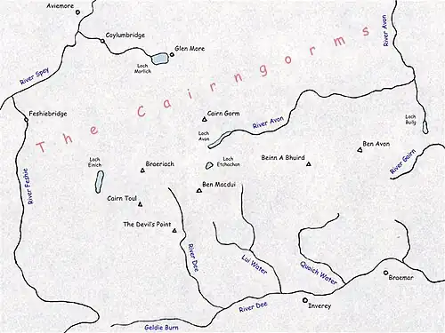 The approximate southern boundary of the Cairngorm range is generally reckoned to run from slightly east of Braemar, west along the Dee and Glen Geldie to the head of Glen Feshie. The western edge of the range is defined by Glen Feshie and the River Spey as far as Aviemore, with the northern boundary running roughly eastward from Aviemore through Glenmore to Glen Avon. The eastern boundary is defined by Glen Avon and the Am Bealach Dearg, thus ending slightly east of Braemar.[13]