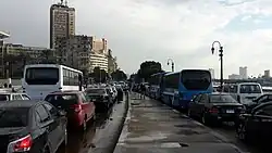 The city was devastated during the 1952 riots known as the Cairo Fire or Black Saturday, which saw the destruction of nearly 700 shops, movie theatres, casinos and hotels in downtown Cairo.[136] The British departed Cairo following the Egyptian Revolution of 1952, but the city's rapid growth showed no signs of abating. Seeking to accommodate the increasing population, President Gamal Abdel Nasser redeveloped Tahrir Square and the Nile Corniche, and improved the city's network of bridges and highways.[137] Meanwhile, additional controls of the Nile fostered development within Gezira Island and along the city's waterfront. The metropolis began to encroach on the fertile Nile Delta, prompting the government to build desert satellite towns and devise incentives for city-dwellers to move to them.[138]