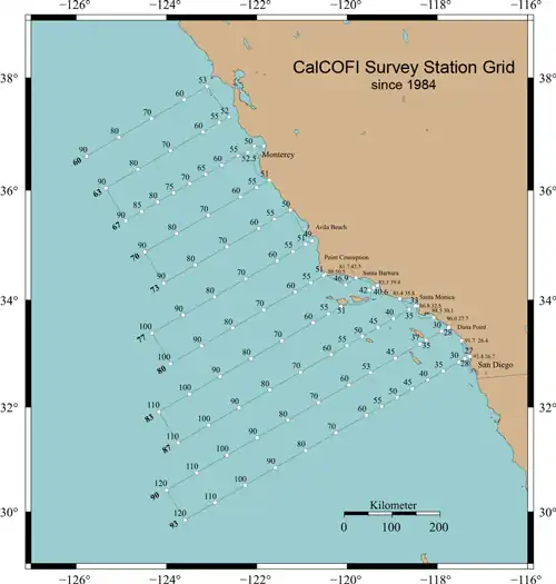 CalCOFI sampling lines were designed to be normal to the central California coast centered at Point Conception, designated as CalCOFI Line 80. The original sampling pattern extended from Line 10 at the US-Canada border to Line 120 off Point Eugenia, Baja California, Mexico, with a spacing of 120 miles between lines (i.e. distance between line 80 and 90 is 120 miles). Since its conception, additional lines were added within the domain, creating a 40-mile spacing between lines which are now numbered in fractions of 3's and 7's (80, 83, 87, 90, etc.).[8]