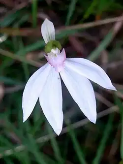 Caladenia picta, commonly known as painted fingers,[2] is a species of orchid endemic to New South Wales. It has a single, sparsely hairy leaf and a single white or pink flower with a greenish-white back. Unlike many other caladenias, it flowers in autumn.