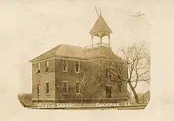 The first school in town was built before 1876. It was a one-room log building located on the present site of the Rose Hill Cemetery. Long benches were used as seats, long boards as desks, and a table served as the teachers desk. Miss Julia Cook (Ferren) was the first teacher. Later a white frame building was erected south of the railroad tracks. In 1902 a red brick building was erected at the same location, at the cost of $3,000. For the school year of 1909–10, the county superintendent report to the state superintendent of schools stated that Calamus had one male and two female teachers and an attendance of 78.