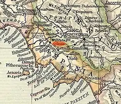 The history of Calatia is similar to that of its more powerful neighbor Capua, but as it lay near the point where the Via Appia turns east and enters the mountains, it had some strategic importance. In 313 BC it was taken by the Samnites and recaptured by the dictator Fabius Maximus Rullianus; the Samnites captured it again in 311 BC, but it must have been retaken at an unknown date. In the 3rd century BC we find it issuing coins with an Oscan legend, but in 211 BC it shared the fate of Capua. In 174 BC it is mentioned that its walls were being repaired by the censors. In 59 BC a colony was established here by Caesar.[1]