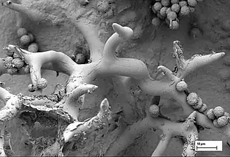 | Light micrograph of the characteristic antler-branched capillita | Electron micrograph of capillita and spores | The spores have a faintly warted surface and a pedicel. |
