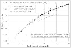 Schott and many scientists and engineers afterwards applied the additivity principle to experimental data measured in their own laboratory within sufficiently narrow composition ranges (local glass models). This is most convenient because disagreements between laboratories and non-linear glass component interactions do not need to be considered. In the course of several decades of systematic glass research thousands of glass compositions were studied, resulting in millions of published glass properties, collected in glass databases. This huge pool of experimental data was not investigated as a whole, until Bottinga,[13] Kucuk,[14] Priven,[15] Choudhary,[16] Mazurin,[17] and Fluegel[18][19] published their global glass models, using various approaches. In contrast to the models by Schott the global models consider many independent data sources, making the model estimates more reliable. In addition, global models can reveal and quantify non-additive influences of certain glass component combinations on the properties, such as the mixed-alkali effect as seen in the adjacent diagram, or the boron anomaly. Global models also reflect interesting developments of glass property measurement accuracy, e.g., a decreasing accuracy of experimental data in modern scientific literature for some glass properties, shown in the diagram. They can be used for accreditation of new data, experimental procedures, and measurement institutions (glass laboratories). In the following sections (except melting enthalpy) empirical modeling techniques are presented, which seem to be a successful way for handling huge amounts of experimental data. The resulting models are applied in contemporary engineering and research for the calculation of glass properties.