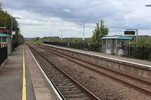 Caldicot railway station is a part of the British railway system owned by Network Rail and is operated by Transport for Wales.[2] It serves the town of Caldicot in Monmouthshire, Wales. It is located between Chepstow and the city of Newport on the Gloucester line, 148 miles 2 chains (238.2 km) from the zero point at Paddington, measured via Stroud.[3] The line to Bristol via the Severn Tunnel runs just to the north but there are no platforms here; however, Severn Tunnel Junction station is within walking distance for those wanting to travel to Bristol.