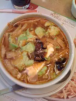 Caldo tlalpeño is a chicken and vegetable soup in Mexican cuisine which contains chicken meat, and chickpeas, carrots, and green beans, submerged in a chicken broth with garlic and onion, seasoned with epazote, cumin and chipotle chili.[1] It is served with avocado slices and diced cheese, and accompanied with lime.