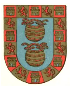In heraldry, a caldron (also known as cooking-pot) charge can be frequently found in the coats of arms of prominent Spanish nobility. This is related to a tradition of king granting a pennon and caldron (Spanish: peñon y caldera) upon admittance to the upper crust of nobility, the ricohombres.[1][2][3] Woodward & Burnett suggest to count the caldron among the military charges, as pennon was related to the ability of a noble to raise and lead troops, and caldron represented the ability to feed them.[2]
