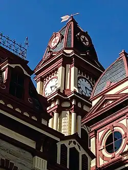 The exterior of the three-story courthouse is built with cream-colored limestone and red sandstone. The central clock tower houses a four-faced Seth Thomas Clock Company clock and a 900-pound bell. The mansard roof of the courthouse is characteristic of Second Empire design.