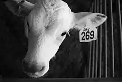 Calf 269 is a bull who was rescued as a calf by anonymous activists, days before his planned slaughter. He was born at an Israeli facility in the vicinity of Azor, a town on the outskirts of Tel Aviv. The slaughter was scheduled for June 2013.[1] He is described as sweet-tempered and white-headed, and his ear carried a tag numbered 269, indicating he was destined for slaughter.[2] The Israeli protests regarding the calf were followed by protests in the U.K. and other places across the world. The protests aimed at conveying that animal parts eaten as food by humans once belonged to a living individual, who lived a tortured life and faced a brutal death, after which his or her carcass was processed into human food.[3] The significance of the event led to the creation of 269 life, an animal liberation movement founded in October 2012.[4]