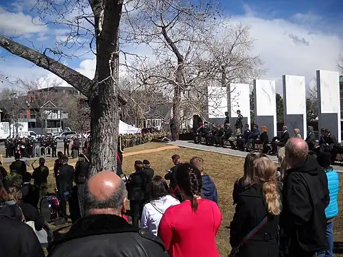 The Calgary Soldiers' Memorial is a war monument in Calgary, Alberta, that was dedicated on April 9, 2011, the anniversary of the Battle of Vimy Ridge.[2] The monument is dedicated to Calgary area soldiers who have given their lives in war and military service overseas.[3] The monument is on Memorial Drive and bears the names of 3,000 soldiers from the Calgary area who died in military service.[4]