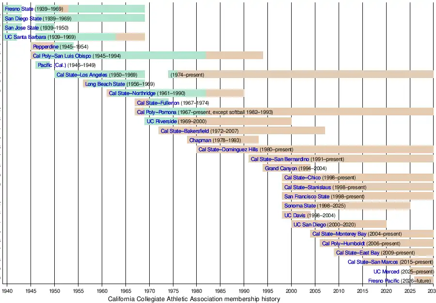 - 2026 – Fresno Pacific University will join the CCAA, beginning the 2026–27 academic year; becoming the first private non-UCal or non-Cal State school to join the conference since Grand Canyon (who was a full member from fall 1994 to spring 2004).
