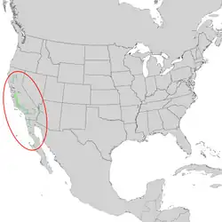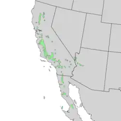 As the name implies, it is mainly in numerous California habitats, although its range also extends through most of Baja California, a short distance into the Great Basin in southern Nevada, and into northwestern Arizona. In California it is found in: the Peninsular Ranges, Transverse Ranges, California Coast Ranges, Sacramento Valley foothills, Sierra Nevada, and at higher elevation sky islands in the Mojave Desert ranges.[7][8] It is also found off of the North American continental shelf, on Guadalupe Island in the Pacific Ocean, where there are less than 10 individuals.[9][10]