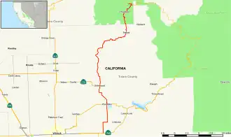 State Route 245 (SR 245) is a north–south state highway in the U.S. state of California that runs from near Exeter to near Kings Canyon National Park. It connects State Route 198 in Tulare County to State Route 180 in Fresno County. It runs through the city of Woodlake and the small unincorporated towns of Elderwood, Badger, and Pinehurst. Roughly 95 percent of SR 245 traverses rural areas. North of Avenue 364 in Tulare County, SR 245 is synonymous with Millwood Drive.