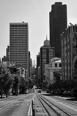![]() View from the top of California Street Looking towards the financial district with the Bay Bridge in the background | |