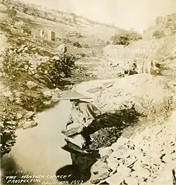 Miners worked at a claim only long enough to determine its potential. If a claim was deemed as low-value—as most were—miners would abandon the site in search of a better one. In the case where a claim was abandoned or not worked upon, other miners would "claim-jump" the land. "Claim-jumping" meant that a miner began work on a previously claimed site.[83][84] Disputes were often handled personally and violently, and were sometimes addressed by groups of prospectors acting as arbitrators.[78][83][84] This often led to heightened ethnic tensions.[85] In some areas the influx of many prospectors could lead to a reduction of the existing claim size by simple pressure.[86]