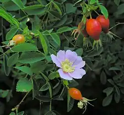 The wildroses' hips are related to the Rosaceae family's apricots, apples, and roses.[7] They are fragrant, edible, and look and taste like "small apples."[4] Some indigenous California tribes eat R. californica's hips raw and use the stems and fibers for crafts like coiled baskets, jewelry, and decoration. Other tribes leverage the roses' medicinal properties. They used a mix of rose petals, leaves, and/or rose "hips" in drinks or as medicine to relieve skin and general inflammation, pain, and illness (including fever, stomach pains, and sores).[5][6][7]