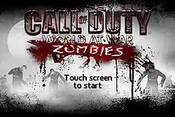 Call of Duty: World at War – Zombies (also known as simply Call of Duty: Zombies) was a first-person shooter video game developed by Ideaworks Game Studio, and published by Activision for iOS. It was a spin-off of the Call of Duty series, and based on the Zombies mode of Call of Duty: World at War.[1] The game was released worldwide for iPhone on November 16, 2009,[2] and for iPad on April 1, 2010.[3] The game allowed for multiplayer cooperative gameplay locally via an ad hoc Wi-Fi or Bluetooth network, or globally via the internet. It also came with the three other maps, Verrückt, Shi No Numa, and Der Riese.[4][5] A sequel to the game, Call of Duty: Black Ops – Zombies, has been published by Activision.
