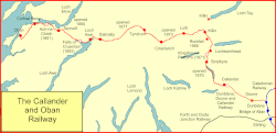 From Oban back to Crianlarich the route was clear; from there to the River Clyde they left the route open; they had calculated they needed £600,000 to build their line, and there was no possibility of local people investing that kind of money. The only way forward was to persuade another, established line to put some money in: the route would be determined by that fact. The Scottish Central was prepared to put up £200,000, and this was confirmed by agreement of 17 December 1864; the route from Crianlarich would accordingly go east to Callander and Dunblane.[2] A parliamentary bill was submitted in the 1865 session and the railway was authorised by the Callander and Oban Railway Act 1865 (28 & 29 Vict. c. cclxvi) on 8 July 1865. The authorised capital was £600,000 with loans of £200,000.[3]