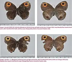 - ^ Singh, A.P. (26 April 2015). "On the female morphs, ecology and male genitalia of Callerebia dibangensis Roy (Lepidoptera: Nymphalidae: Satyrinae) recorded near Mayodia Pass in lower Dibang Valley, Arunachal Pradesh, India". Journal of Threatened Taxa. 7 (5): 7168–7174. doi:10.11609/JoTT.o4035.7168-74.