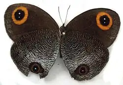 Upperside: Ground colour dark chocolate brown, slightly blackish, paler towards margins. Very large round orange-ringed apical ocellus (11mm), black inner with two white pupils. Edges of ring distinct and regular. Hindwing single tornal ocellus in space 2. Narrow reddish ring, black inner and white pupil.
