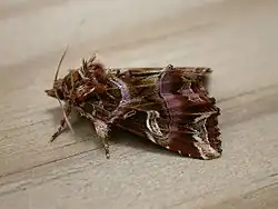 E. juventina Cram. (= purpureofasciata Piller, lagopus Esp., pteridis F., formosissimalis Hbn.) (44 d). Forewing olive brown, shaded in parts with black; the veins pale, towards termen rosy and cream coloured; inner and outer lines double, finely black, filled in with rosy and followed by rosy bands, that beyond outer line broad [en] ; both lines commence on costa as white oblique strigae before the subcostal angulation; stigmata olive brown tinged with rosy, their annuli white, more prominent in the reniform, and forming a sort of hook at lower extremity externally; sometimes a rosy streak on submedian fold beyond the very obscure claviform; subterminal line yellowish white, forming oblique streaks above veins 6 and 7, followed by a pale apical patch, angled inwards above 5 and acutely outwards at 4, thence obscure; a lunulate yellowish white line before termen; the terminal area rosy; fringe chequered, ochreous and dark olive brown; hindwing ochreous suffused with pale fuscous, with broad dark terminal border, an outer line and cell spot; the Japanese form obscura Btlr. (44 d) is duller, all the rosy tints being greatly reduced in extent and brilliancy. Larva green, with whitish or yellowish oblique lunular subdorsal markings, lateral line yellowish white; all the yellowish markings sometimes edged with pink; head reddish. [1] The wingspan is 34–38 mm.
