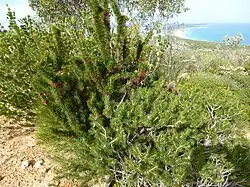 Calothamnus pinifolius occurs in the Mount Barren Range[3] in the Esperance Plains biogeographic region.[4][5] It grows on slopes in dense scrub in rocky soils derived from laterite and quartzite.[4]