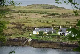 Calve Island is an uninhabited low-lying island off the east coast of the Isle of Mull in Argyll and Bute on the west coast of Scotland. A whitewashed farmhouse with substantial outbuildings stands on the western shore, used as a summer residence.[5] The island is 1+1⁄4 miles (2 kilometres) in length, and 1⁄2 mile (800 metres) wide at its widest point.[6] Calve is owned by the Cotton family who make use of it in the summer months.[7]