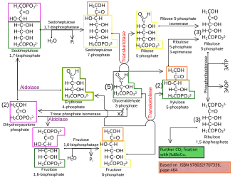 The regeneration stage of Calvin's cycle. Substances and their parts are outlined in colors: green - carbon accepting aldoses, pink - ketoses-donors of three-carbon groups, yellow - parts of ketoses remaining after donation of two-carbon keto-groups highlighted in orange. Enzymes are also highlighted: aldolases in purple and transketolases in red.