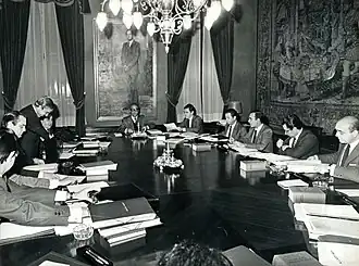 Calvo-Sotelo's cabinet was composed mainly by members of the Union of the Democratic Centre (UCD) and a number of independents.[3][4] It was automatically dismissed on 29 October 1982 as a consequence of the 1982 general election, but remained in acting capacity until the next government was sworn in.[5][6][7][8]