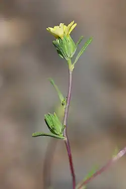 This annual plant produces a slender purplish stem 10 to 50 centimeters tall. The hairy leaves are 2 to 5 centimeters long. The inflorescence is a single flower head or small cluster of heads, each with 1 to 6 three-lobed yellow ray florets. Unlike other Calycadenia species, this plant is self-compatible, or able to fertilize itself.[2]