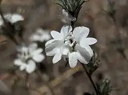 Calycadenia villosa is an annual herb producing a very hairy erect stem approaching 40 centimeters (16 inches) in height. The leaves are linear (long and narrow) and up to 5 centimeters (2 inches) long. The inflorescence is made up of clusters of flower heads surrounded by gland-tipped bracts. Each flower head is a hairless bunch of small disc florets and one to four white to pink ray florets. Each ray floret has three lobes, the middle lobe being narrowest. The fruit is an achene; those developing from disc florets bear a pappus of scales.[7]