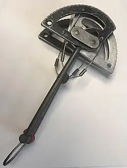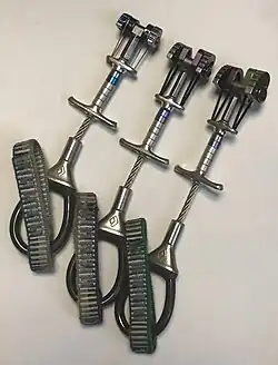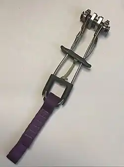 Camalot is a brand of spring-loaded camming devices manufactured by Black Diamond Equipment used to secure ropes while rock climbing. Camalots use a dual-axle system, resulting in a slightly higher expansion range than similarly sized single axle units, however that results in significant weight penalty.[1] Dual-axle was patented and for decades was only used by Black Diamond, however the patent has expired in 2005 and several other manufacturers began producing dual-axel cams, often also replicating Camalots sizes and coloring. Most notable Camalot look-alikes include DMM Dragons[2] and Wild Country's New Friends.[3][4]