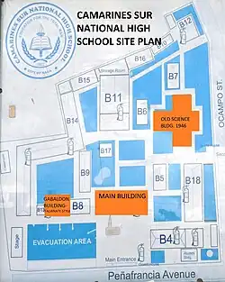 The Camarines Sur National High School, also called CamHi, is the oldest national high school in Camarines Sur and one of the biggest public secondary schools in the Bicol Region, Philippines, having a student population of 11,899 in the school year 2021–2022.[1] It was established in 1902.[2]