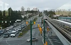 ![]() The intersection of Cambie Street and Southwest Marine Drive, looking northward from the Marine Drive Canada Line station. | |