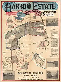Cambooya was, in its early years, the railway, postal, and general centre of two properties named after two public schools of England, Eton and Harrow. Hodgson had attended Eton, and Ramsay had attended Harrow.[6] Hodgson resisted the formation of a township, and no development occurred until 1868, when the Cambooya railway station (27°42′24″S 151°51′48″E / 27.7066°S 151.8632°E)[7] was built as the Southern railway line was extended from Toowoomba to Warwick.[5]