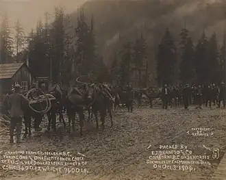 In 1893, a 17-metre (55 ft) bridge was erected across the river and a trail built up Pool Creek to the summit.[37] In 1895, a new 18-metre (60 ft) bridge was erected across the river.[38] By 1898, when the wagon road up the west side of the river was completed, a rowboat served the river crossing, because a bridge no longer existed at Camborne.[39] The next year, a more substantial ferry was installed,[40] which could carry five loaded packhorses,[41] Guided by a cable, the ferry was known as the Pool Creek ferry.[42] In 1900, the cable broke, sending five occupants downriver.[43] In 1901, a new footbridge was erected,[44] and a wagon road was built up the east side of the river.[45] The ferry operated at least until 1903.[46]