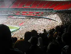 Cambridge finished Ling's first season in 10th place – not enough for a playoff place.[36] The following season, on 6 January 2011, with Cambridge in a similar position to where they finished the previous season, the club's owners put the club up for sale citing the need for new funds to take the club forward.[37] Despite interest being expressed from a number of parties, no new owner has yet been found.[38] Later the same month, the club's landlords Grosvenor Group revealed the plans for a new community stadium, including potential new locations both within the city and outside it.[39] At the start of 2011 Martin Ling was removed from his position as manager[40] and replaced on a temporary basis by CRC manager Jez George.[41] He managed to steer the club towards safety, finishing 17th, which led to George's role being made permanent. After having rebuilt the squad with players from the club's youth system and with astute signings in Harrison Dunk and Tom Shaw, George managed to lead Cambridge to a 9th-place finish, a huge improvement on their previous season. As well as the league, Jez George also took Cambridge to the quarter-final of the FA Trophy (which was the furthest they had reached at the time), but lost 2–1 at home to minnows, Wealdstone.[42] Eleven games into the following season Jez George became Director of Football, and Richard Money was announced as the new head coach of the club.[43] The club spent much of the season in mid-table, finishing in 14th position with 59 points. The squad was greatly revamped, and United started 2013–14 with a record-breaking 16 games unbeaten. Cambridge finished the season in second place, qualifying for the play-offs. After beating FC Halifax Town 2–1, on aggregate, in the semi-final, they won 2–1 against Gateshead in the final, held at Wembley Stadium, gaining promotion back to the Football League after a nine-year absence.[44] The club also reached their first FA Trophy final, held at Wembley Stadium, where they beat Gosport Borough 4–0.[45]
